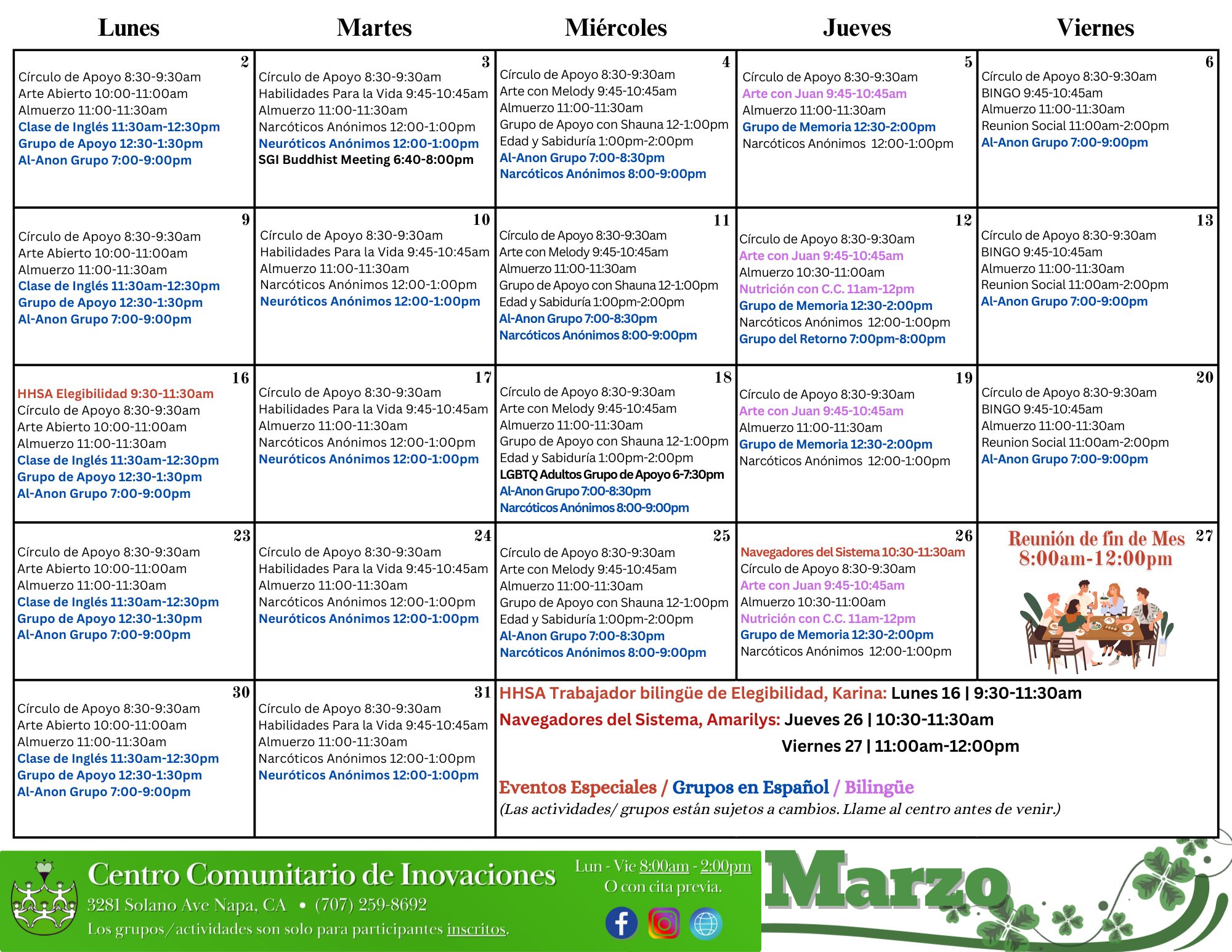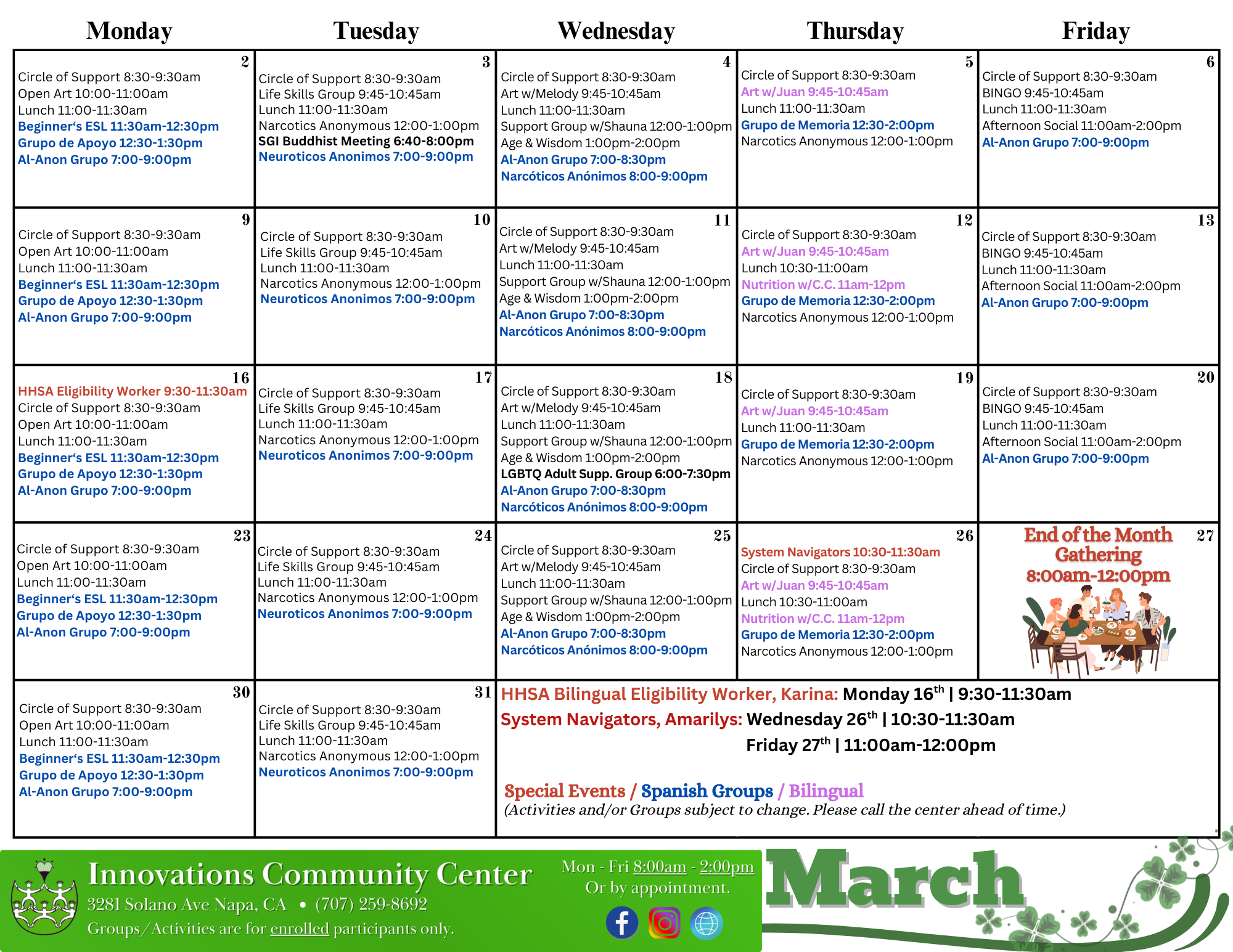 PLEASE NOTE: Groups and activities, including scheduled times are subject to change. Please contact us directly by calling the Center for the best information (707) 259-8692.