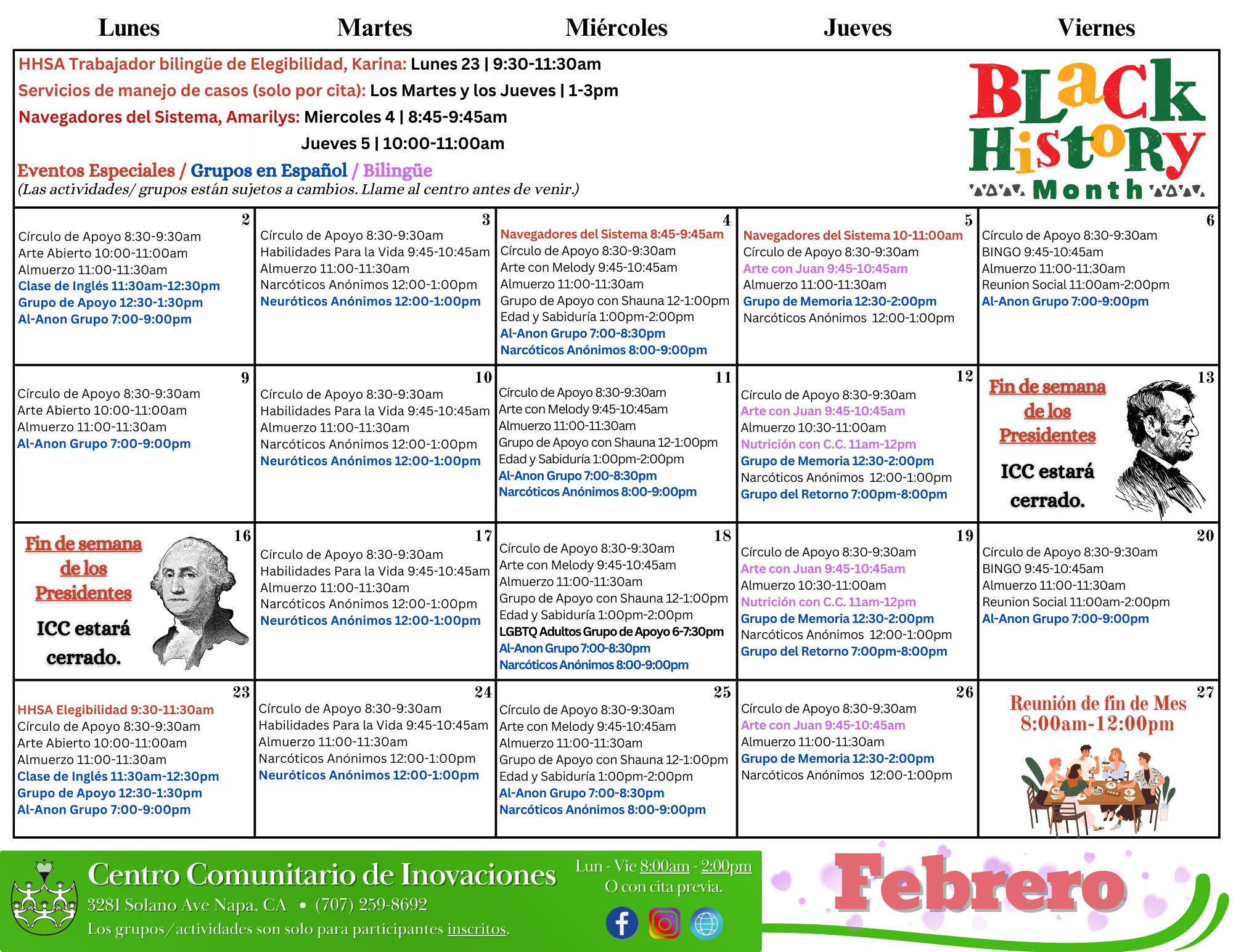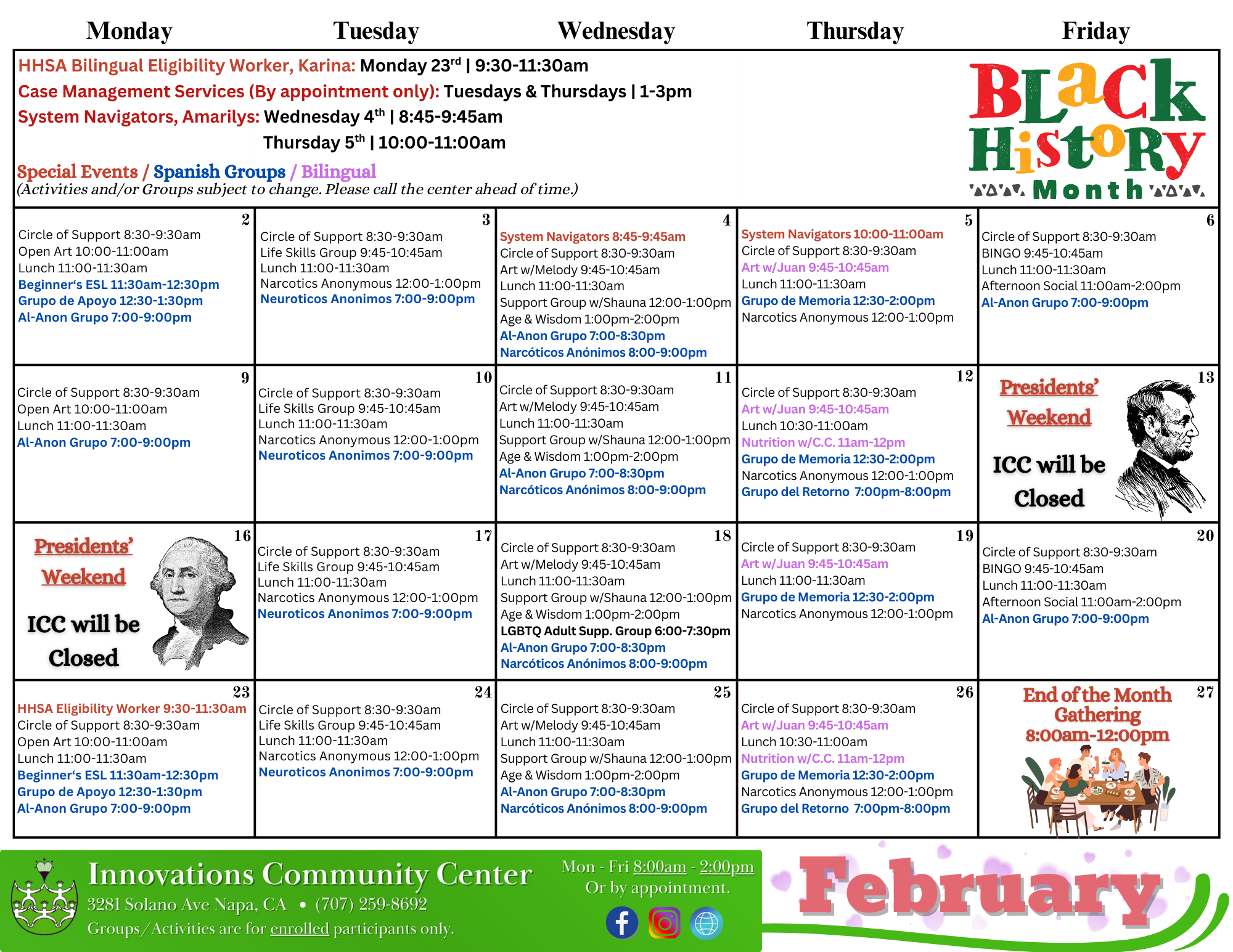 PLEASE NOTE: Groups and activities, including scheduled times are subject to change. Please contact us directly by calling the Center for the best information (707) 259-8692.